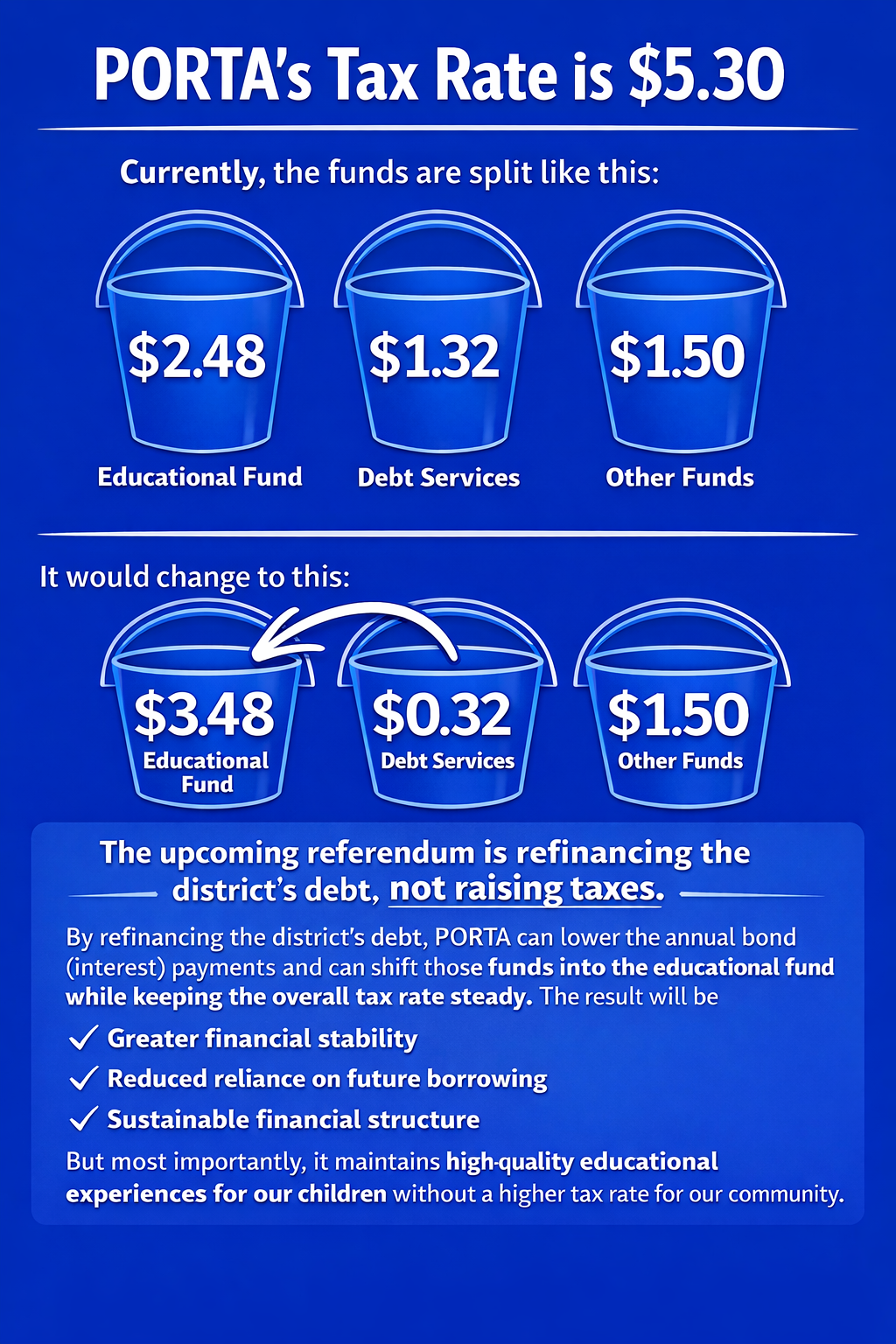 For the past decade, PORTA has relied on Working Cash Bonds—essentially short-term loans—to cover operating expenses in the Education and Transportation Funds. While this allowed the district to maintain programs, it’s not a sustainable long-term solution. Each bond issue adds interest costs and keeps the district in a borrowing cycle. This referendum offers a permanent fix that creates stability without additional tax burden.